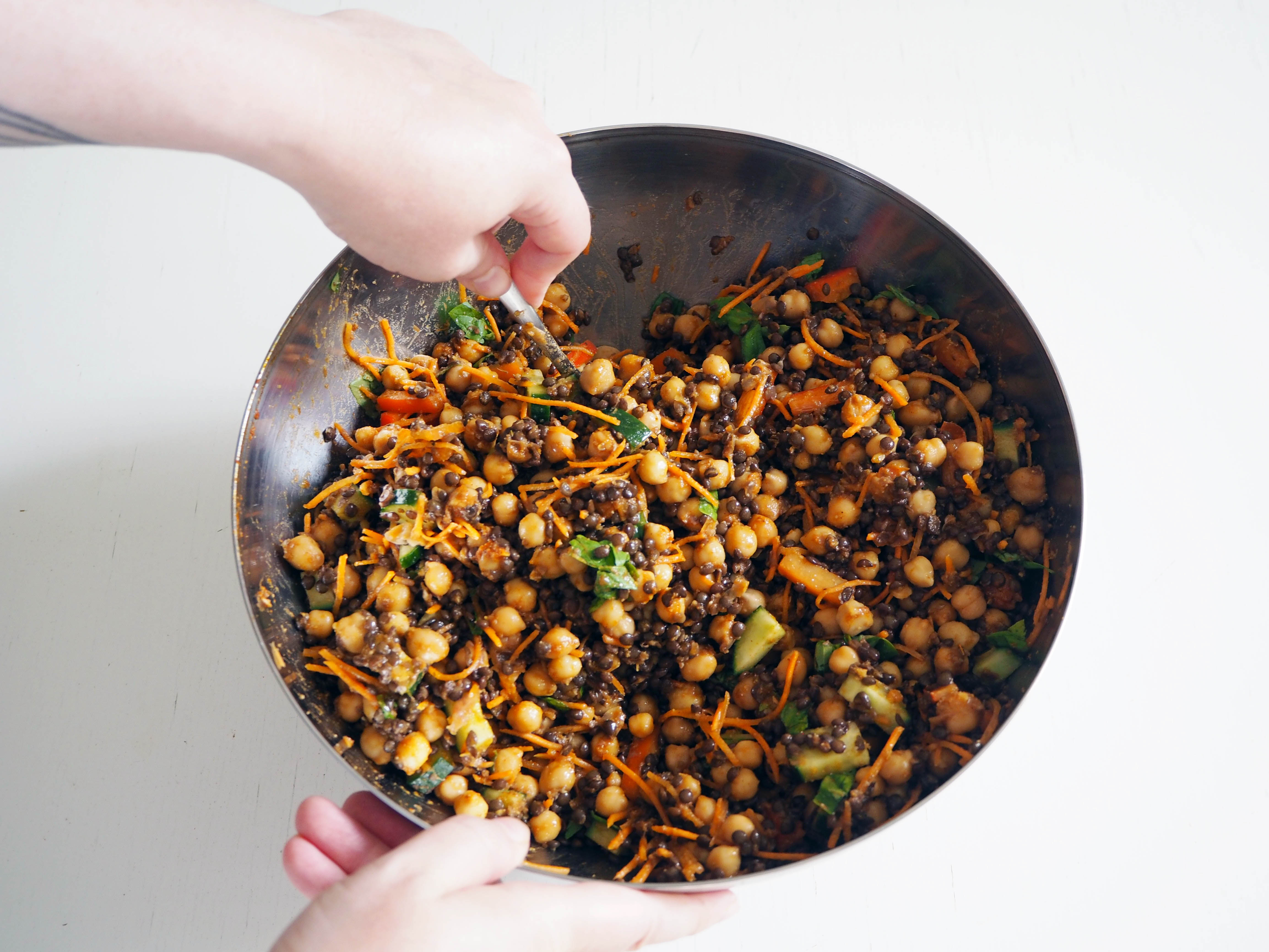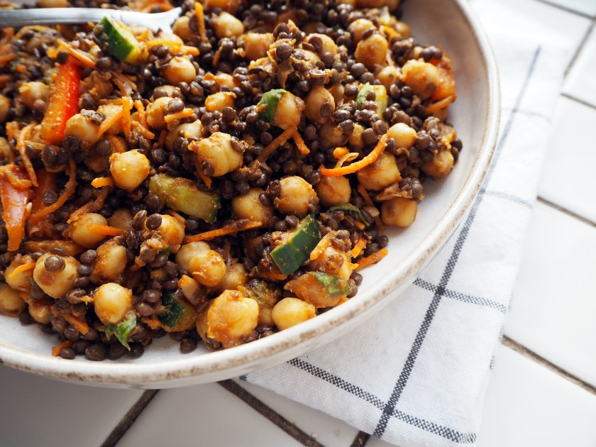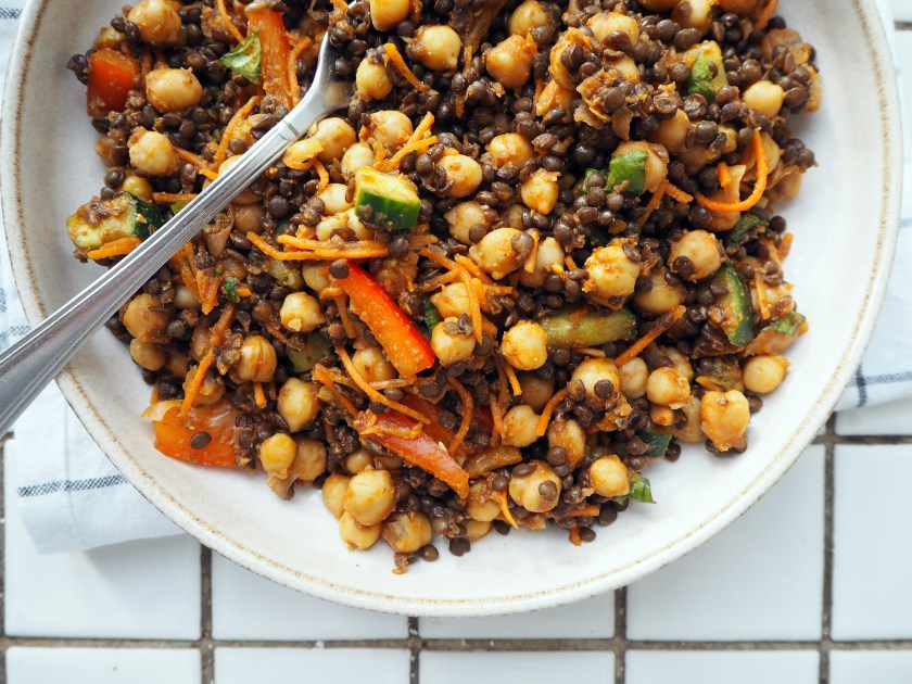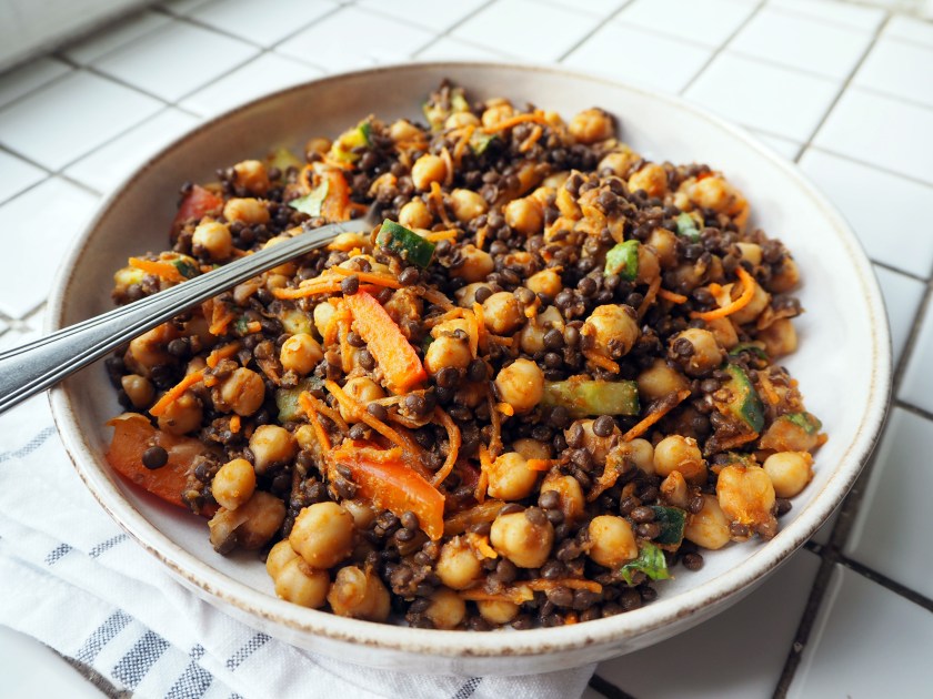 This chickpea and lentil salad is one of the dishes for this week. It’s pretty easy to prepare and can last a long time. Lentils and chickpeas are high in protein and fibre, among other things. As I did this for the whole week, I made a big batch. Feel free to divide all the measurements in half for a smaller portion. Enjoy!