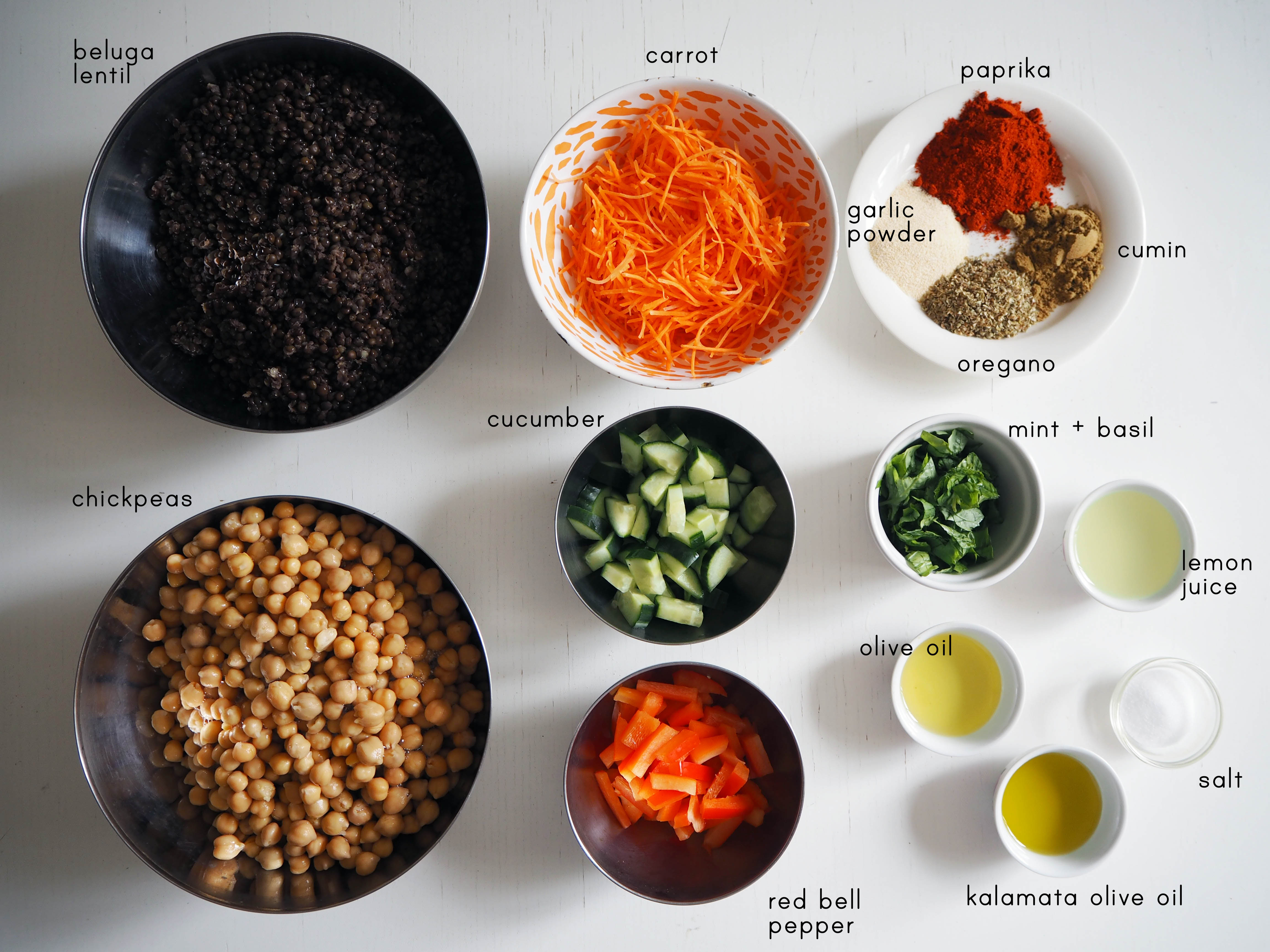 3 dl + 5 tbsp (or 1 1/2 cups)(dry measurement) beluga lentils, cooked for 30 minutes in a pot with water three times the lentil measurement, then drained after cooking