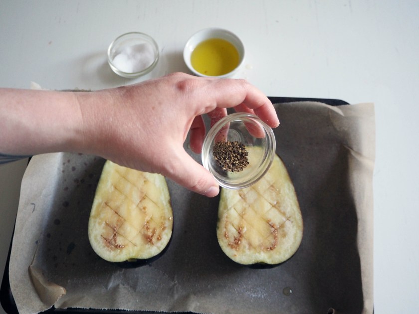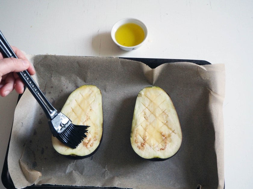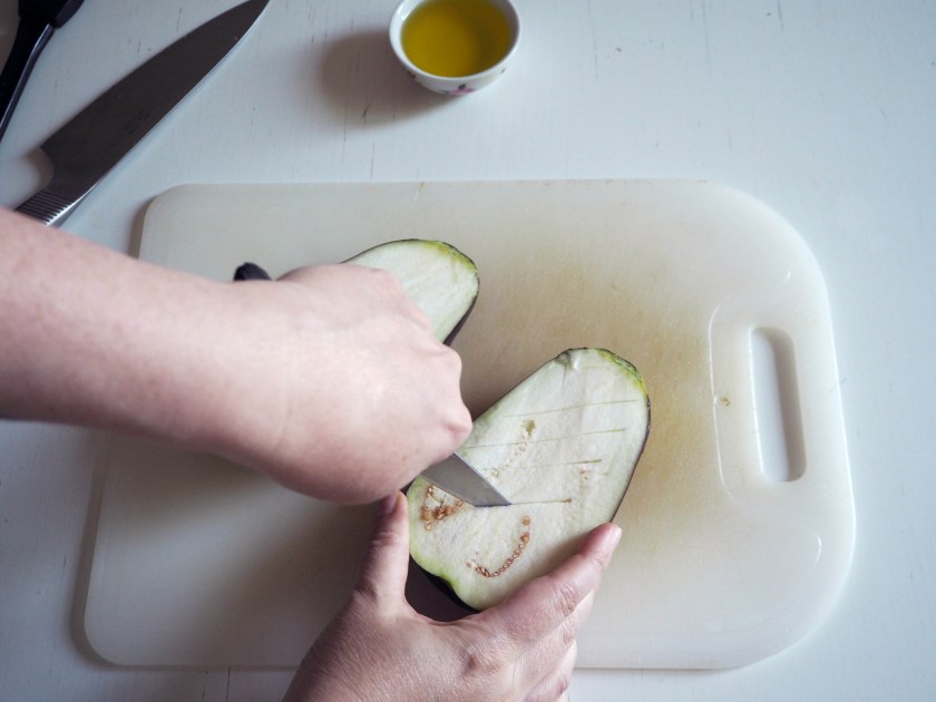 2. Cut the aubergine in 2 lengthwise. Cut crosses in the aubergine’s flesh to make it easier to roast.