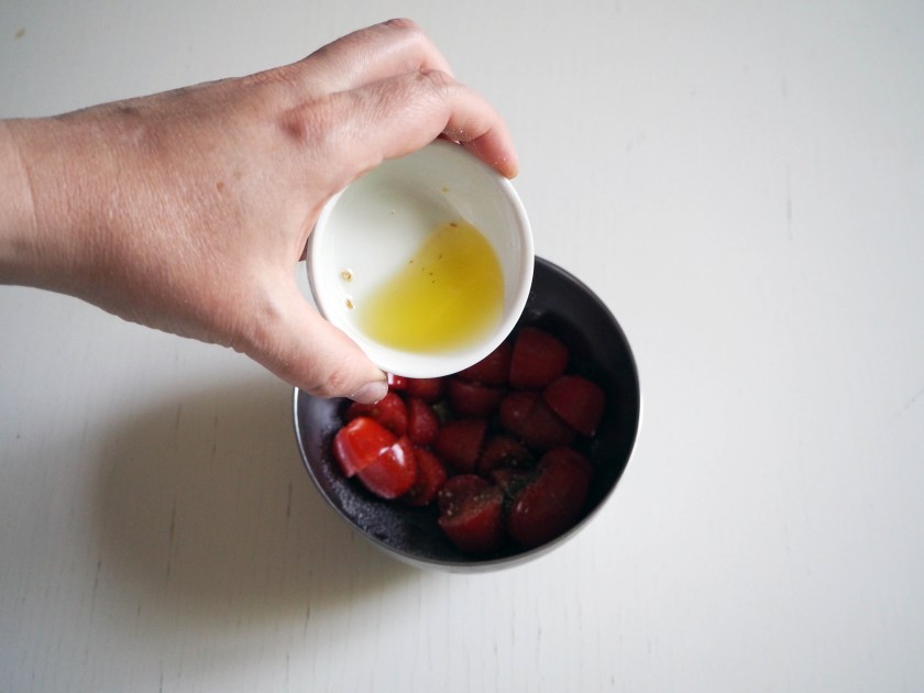 4. While the aubergine is roasting, add the remaining salt, pepper and olive oil to cherry tomatoes and mix well.