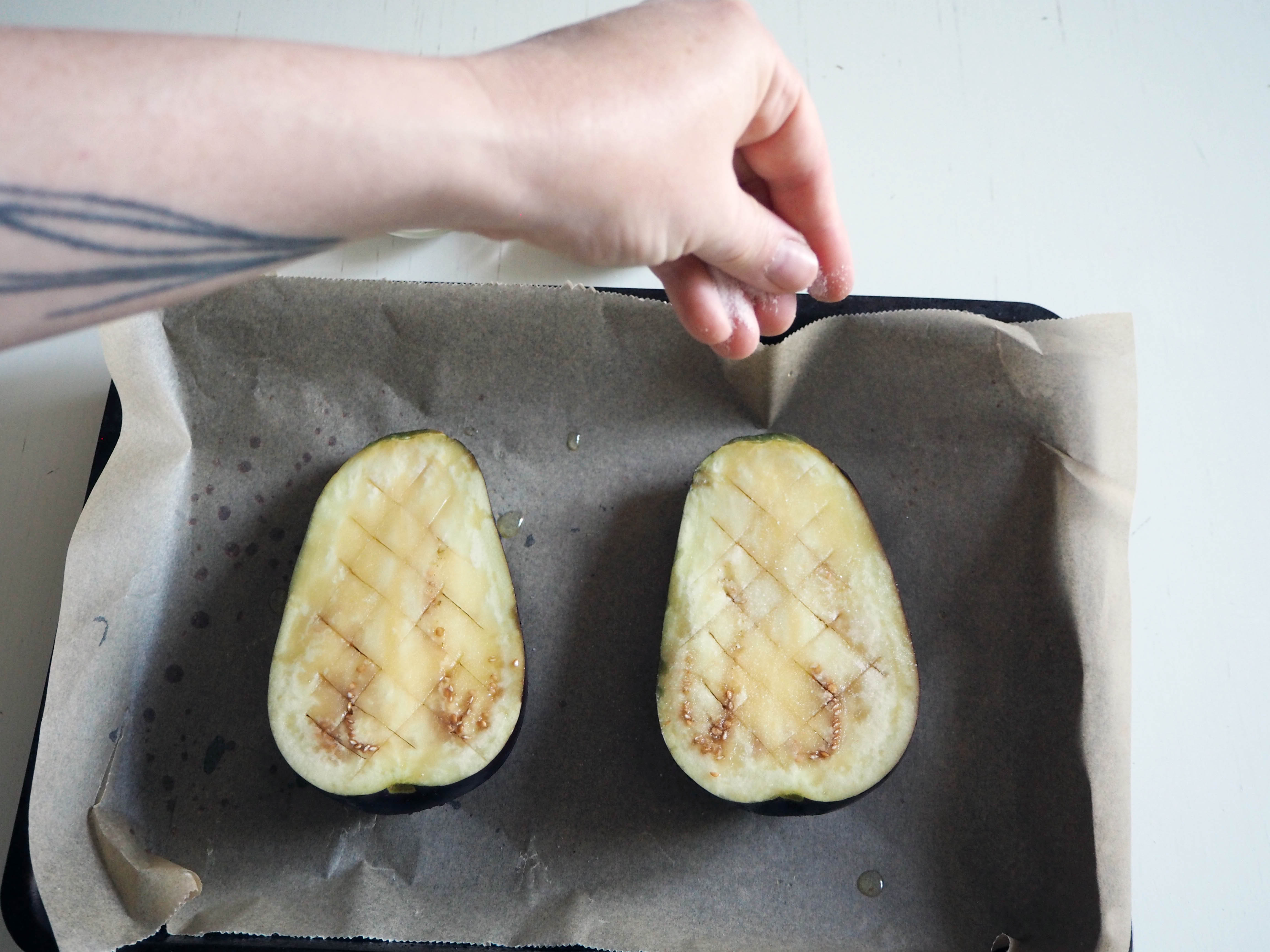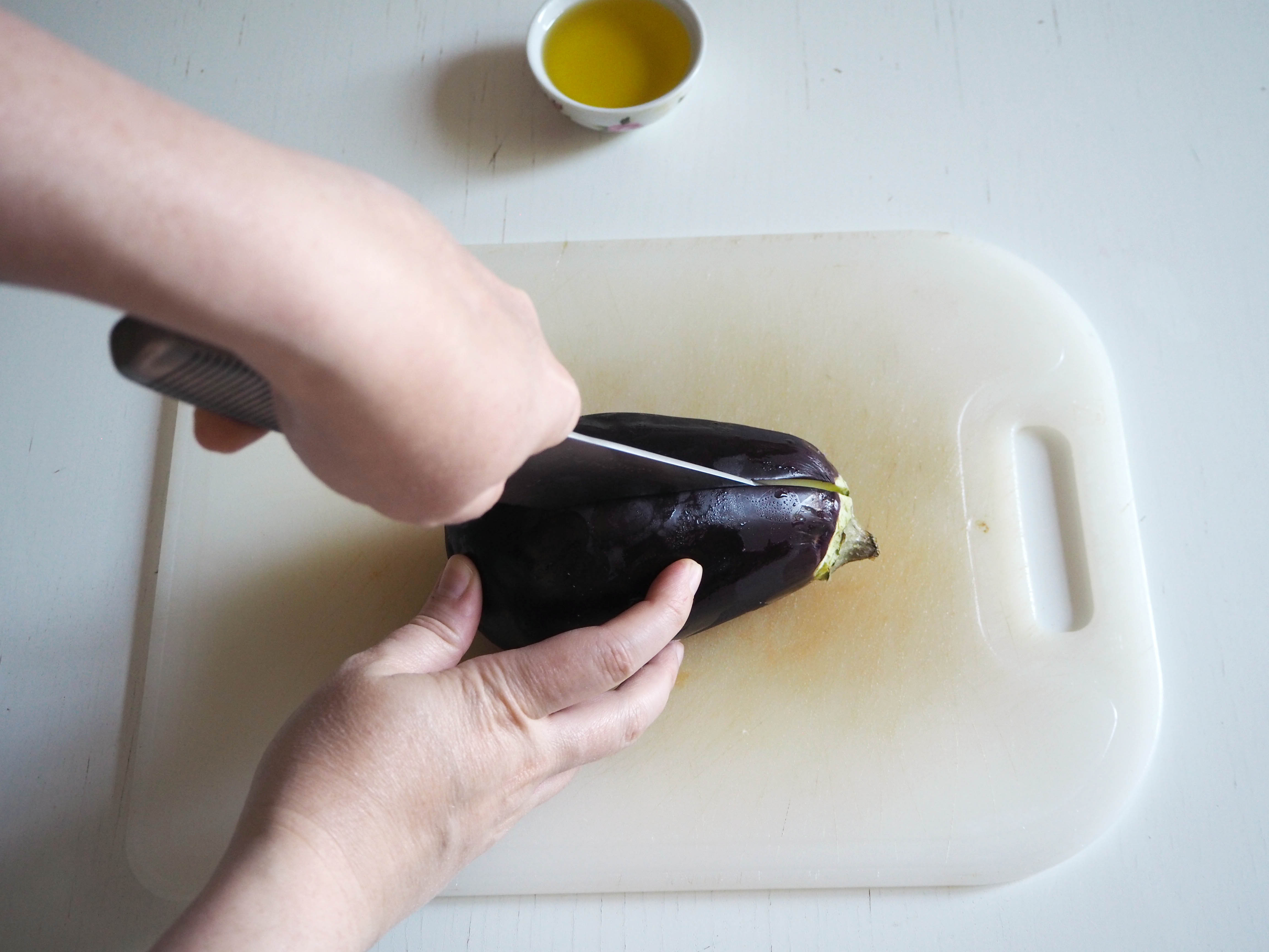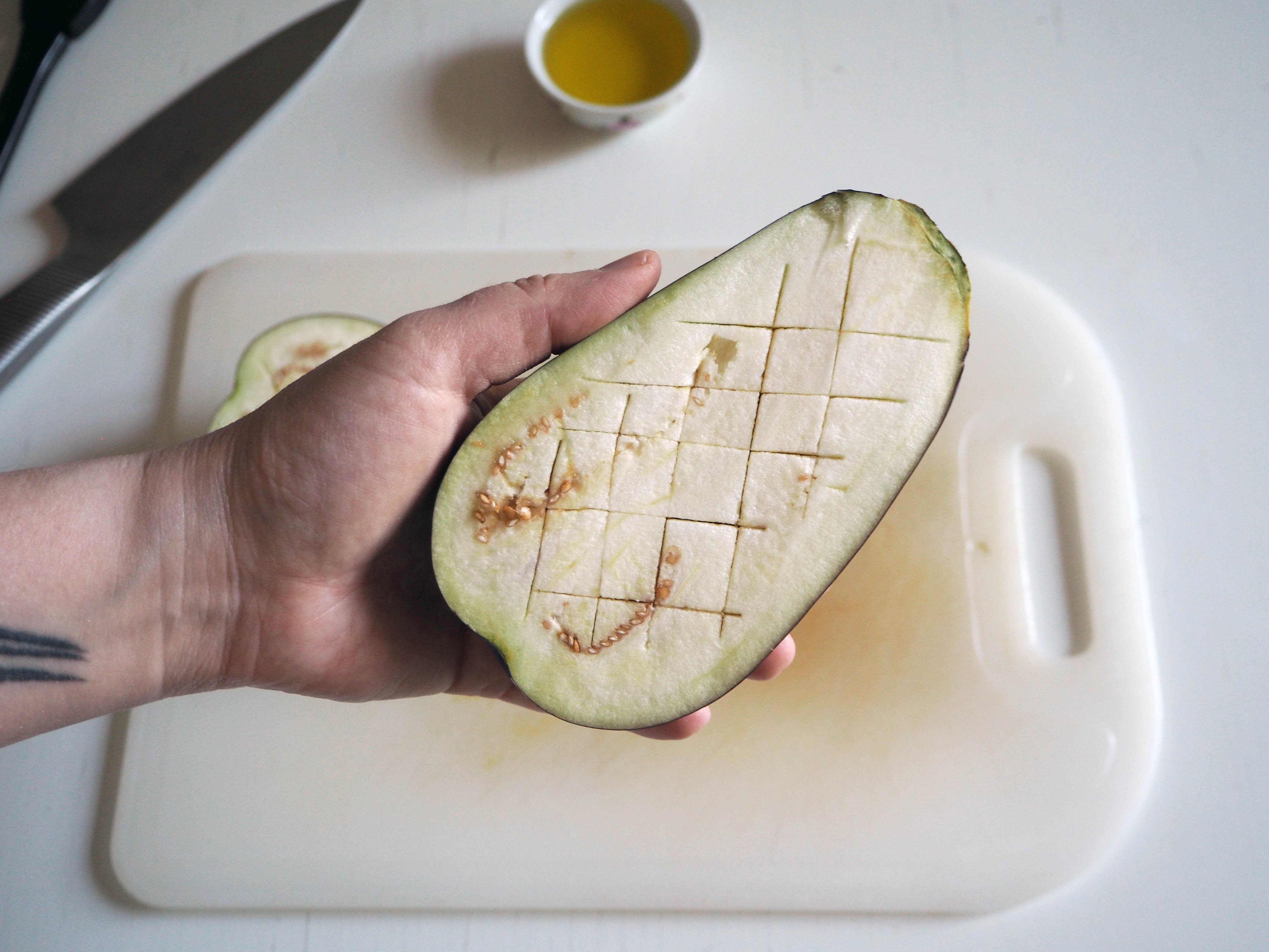 2. Cut the aubergine in 2 lengthwise. Cut crosses in the aubergine’s flesh to make it easier to roast.