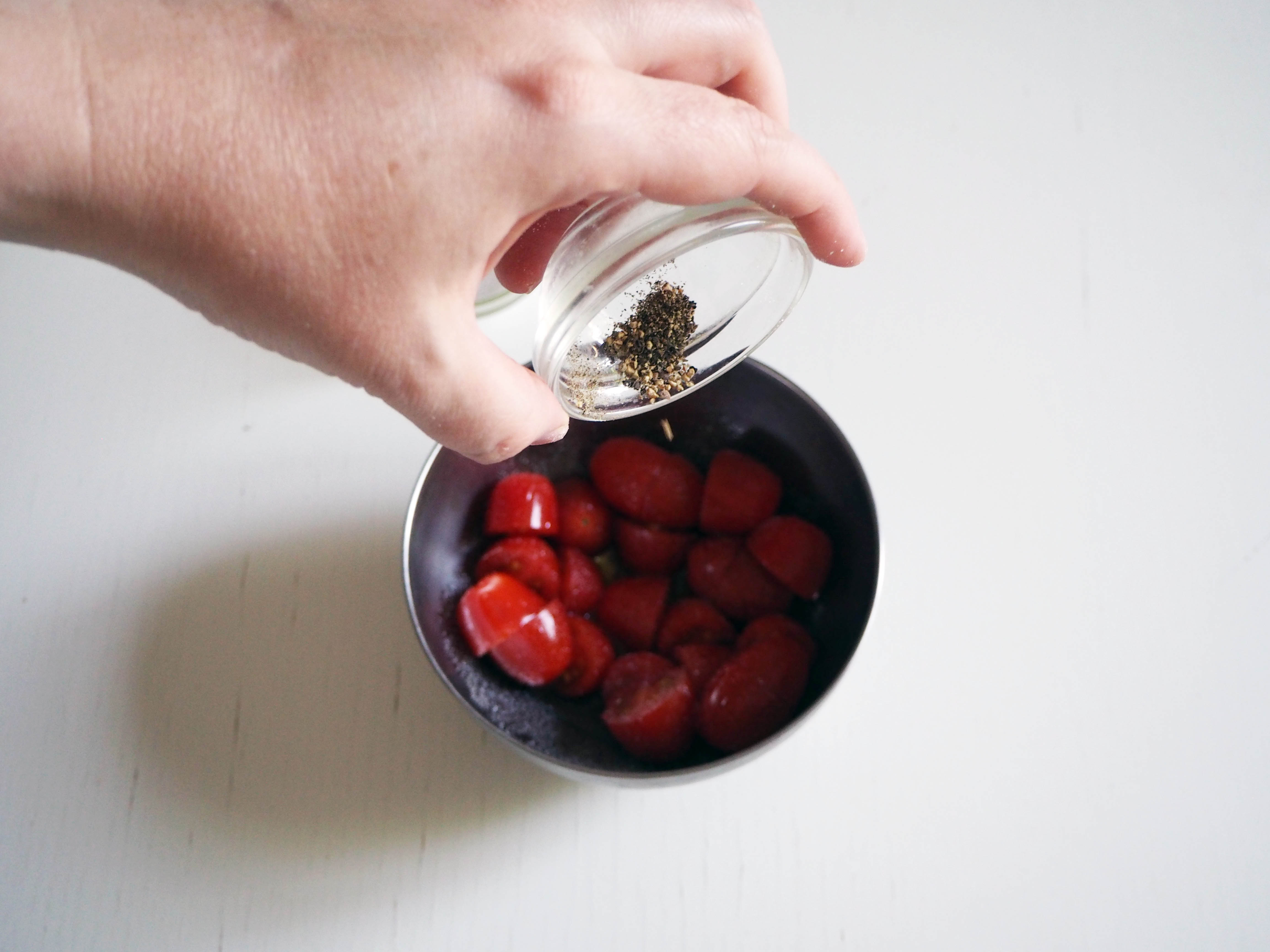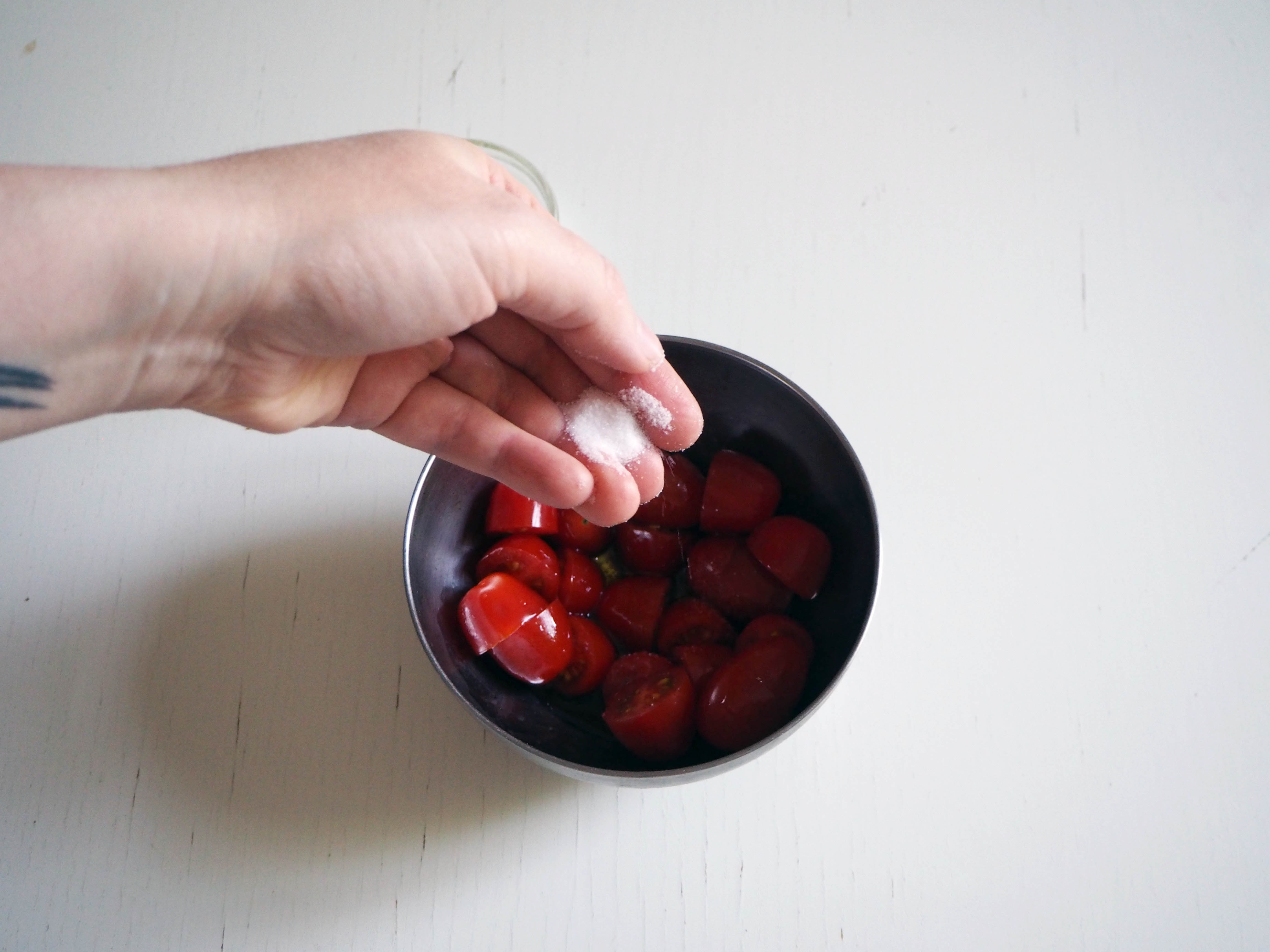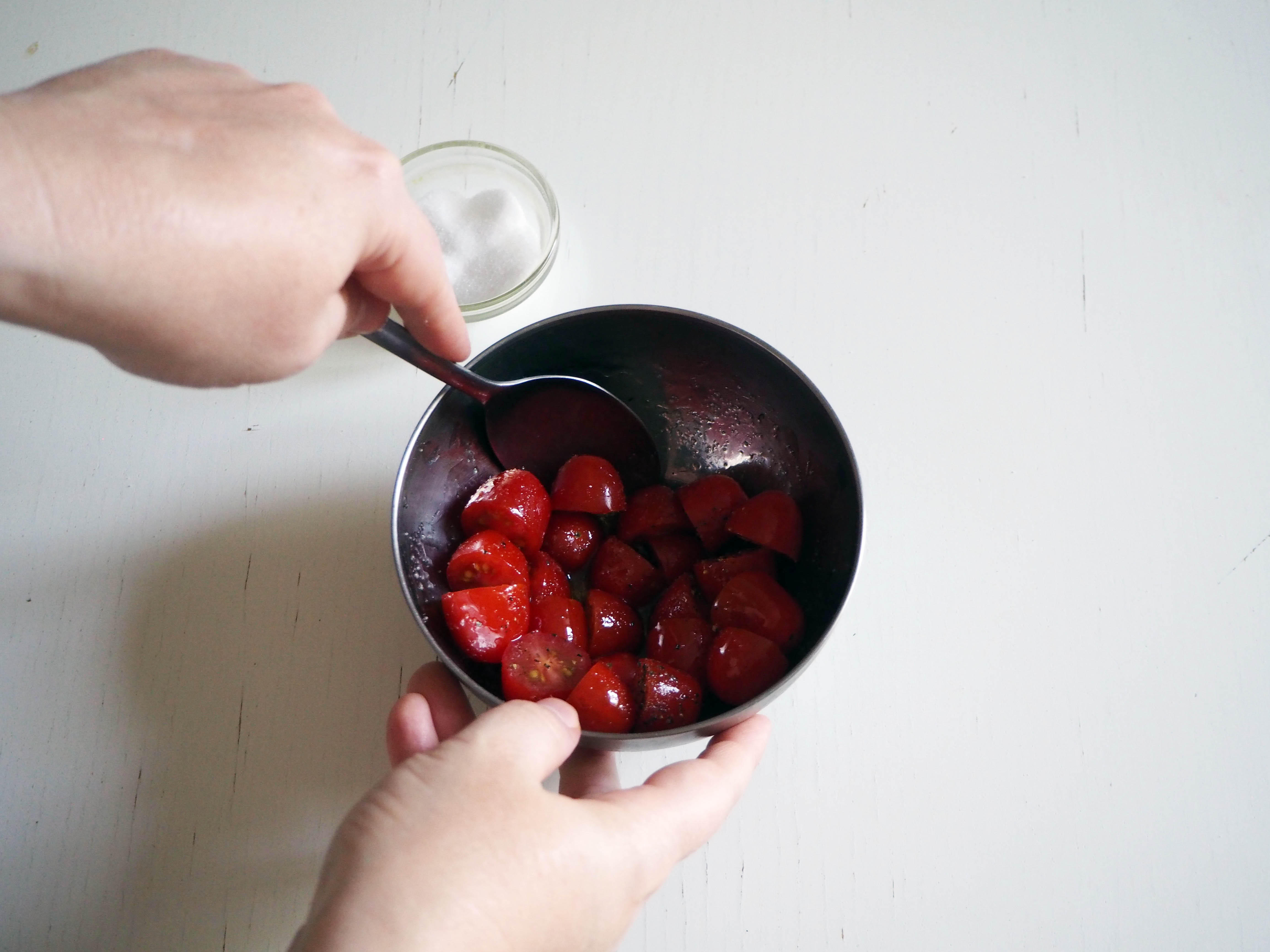 4. While the aubergine is roasting, add the remaining salt, pepper and olive oil to cherry tomatoes and mix well.