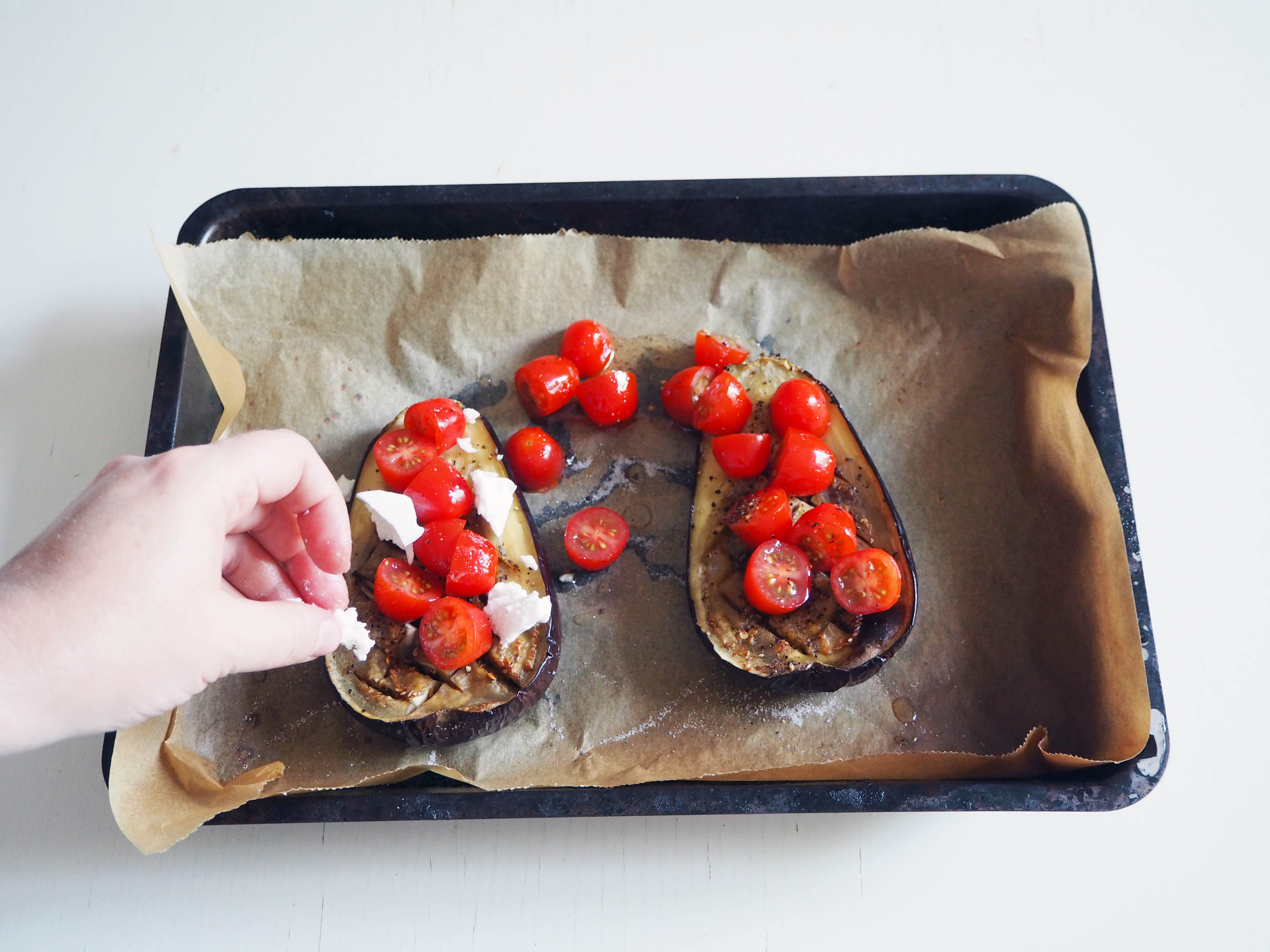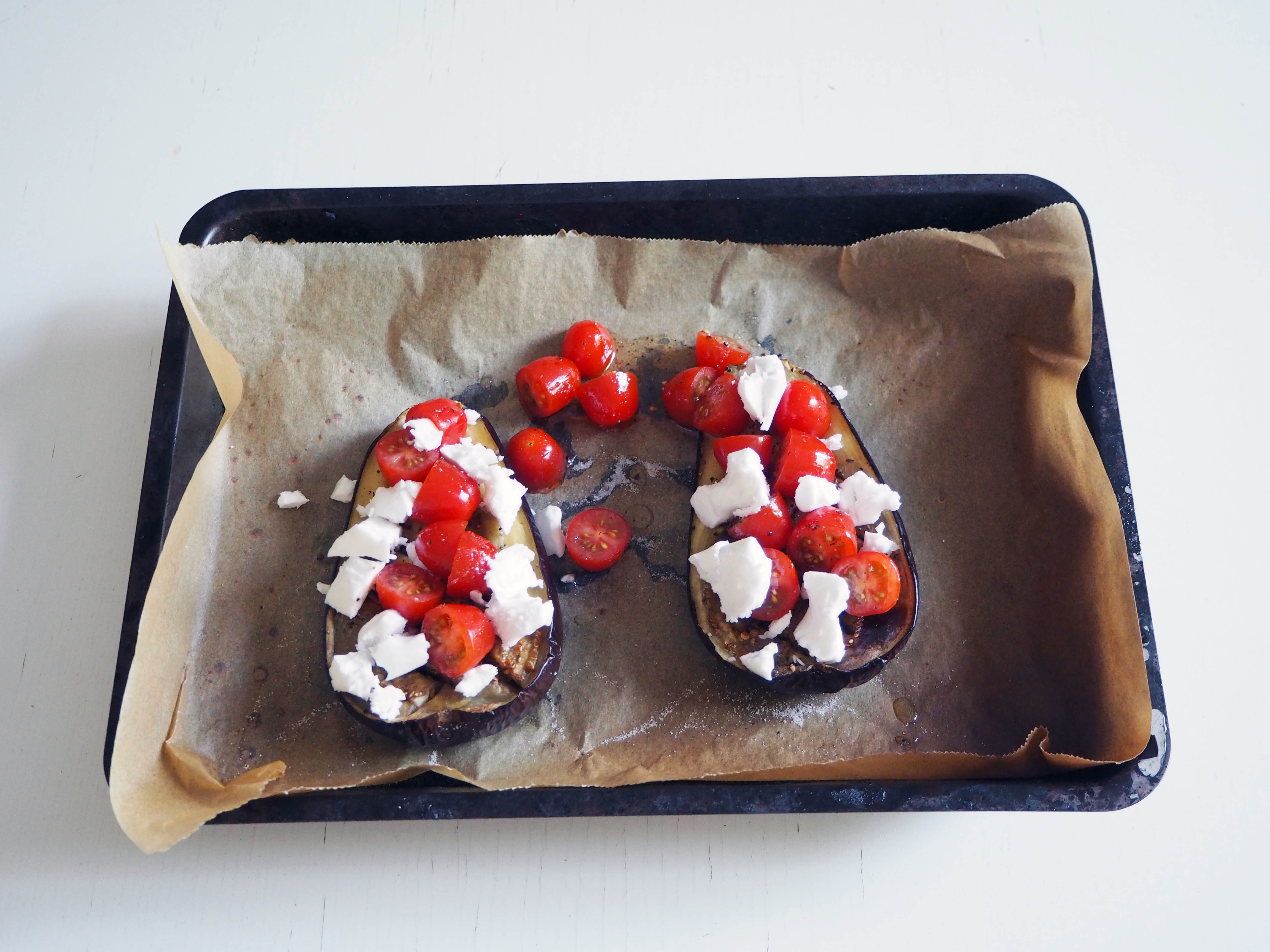 5. At 30 min mark, take the aubergine out of the oven (do not turn off the oven!). Put a few cherry tomatoes on the aubergine pieces and the remaining ones on the tray. Put a few spoons of vegan cheese on the aubergine pieces as well. Put the tray back in the middle section of the oven and roast for 10 more minutes.