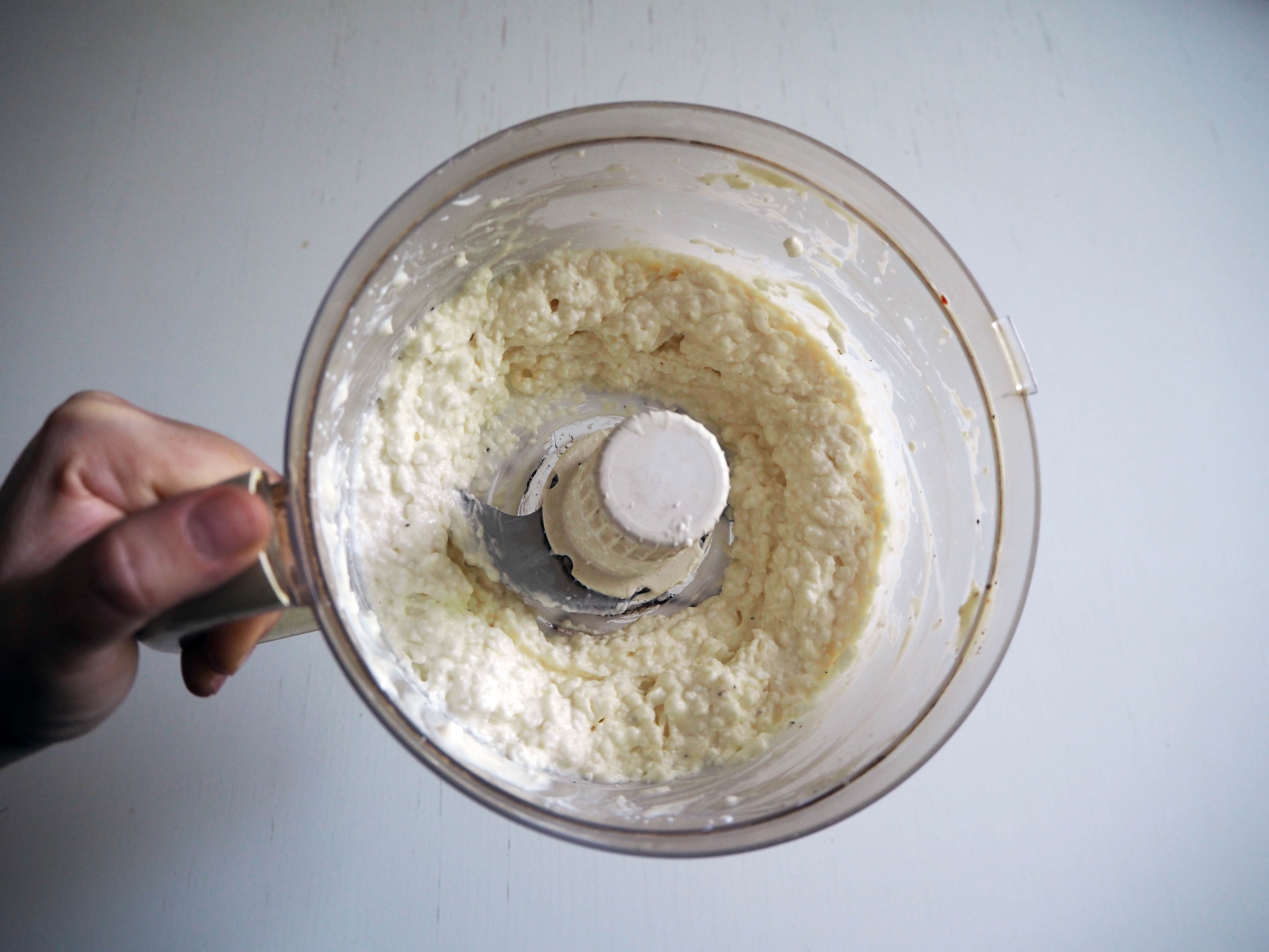 7. Now, let’s make the whipped feta. Remember, you can make this beforehand; in this case, you can prepare the service as soon as the aubergine is out of the oven when everything is hot. To make the whipped feta, just put all the ingredients except chilli pepper flakes in a food processor and process until you get the texture you like.