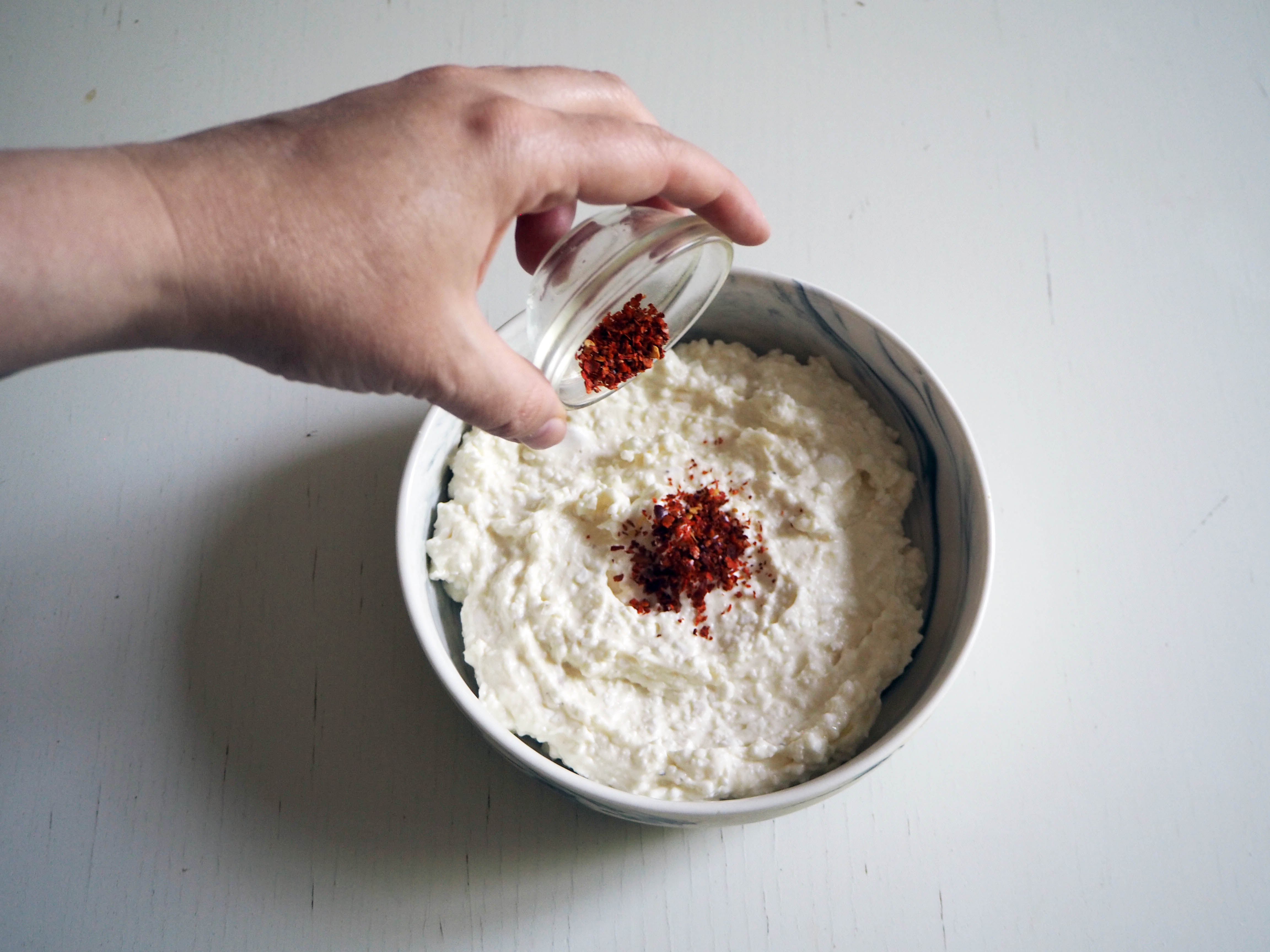 8. Transfer the whipped feta to a small bowl. If you use chilli pepper flakes, add them to the dip and just mix with a spoon.